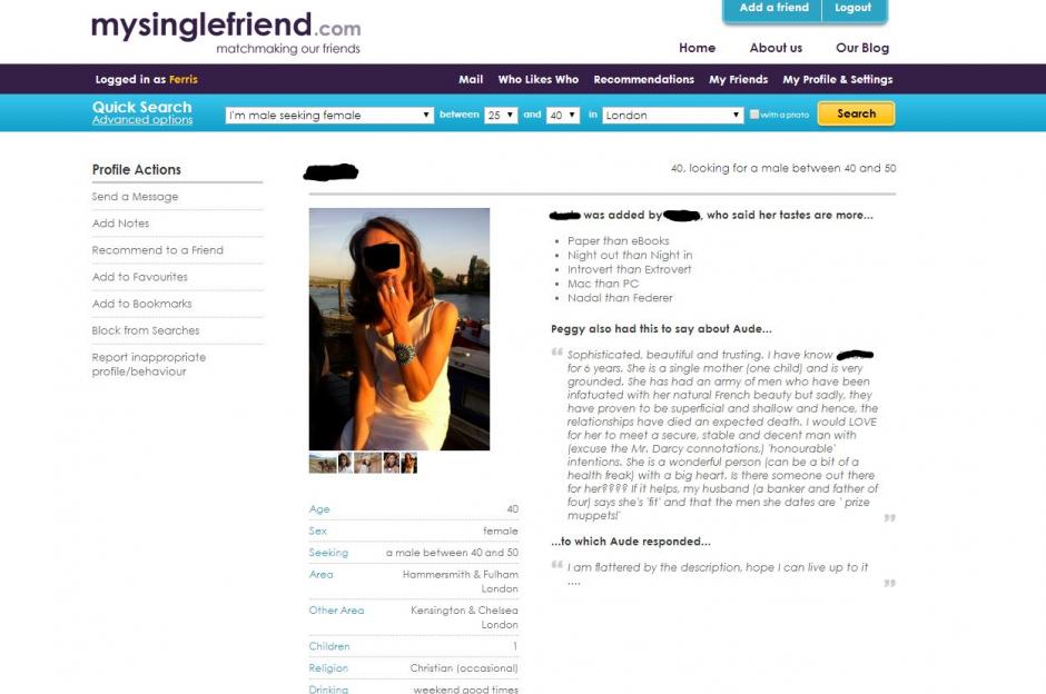 Every profile contains firstly a statement written by the recommending-friend, then a response from the single being recommended. Of course few friends dwell on the bad points! Nevertheless this discursive format does produce interesting insights. If you’re tired of dating sites that have boring profiles or are only about photographs, then this site is a breath of fresh air.